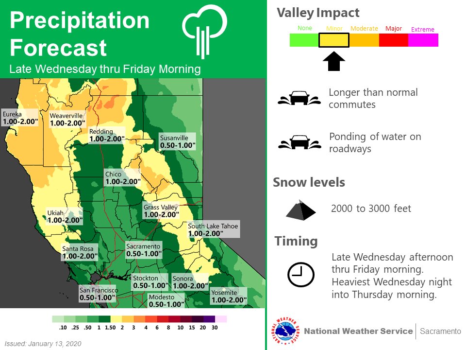 The stronger mid-week system will bring a widespread half inch up to an inch of rain over much of the Valley, locally higher up toward Redding. Slow down on wet roads & allow extra time to reach your destination.