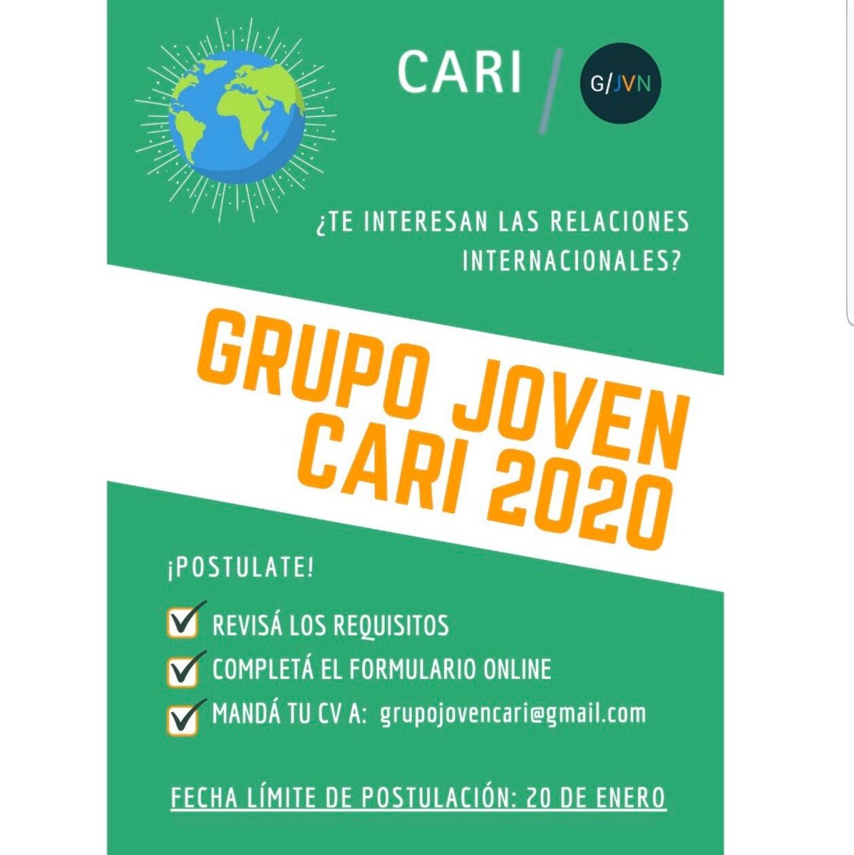 El Grupo Joven del CARI abre su convocatoria 2020, cuyo cierre es el 20 de enero. Envío de formulario online https://forms.gle/56nUw9op4Tuh7Pze6 … y envío de CV a grupojovencari@gmail.compic.twitter.com/3IZITz7XHT