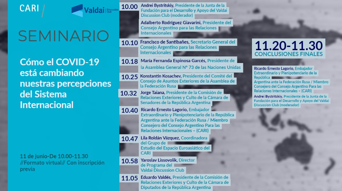 Jueves 11 a las 10.00: Seminario CARI-VALDAI: "Crisis del multilateralismo: cómo COVID-19 está cambiando nuestras percepciones del sistema internacional" Inscripciones: https://forms.gle/qoSKZbe4FauXP6o48 …pic.twitter.com/sRxqMIUiKL