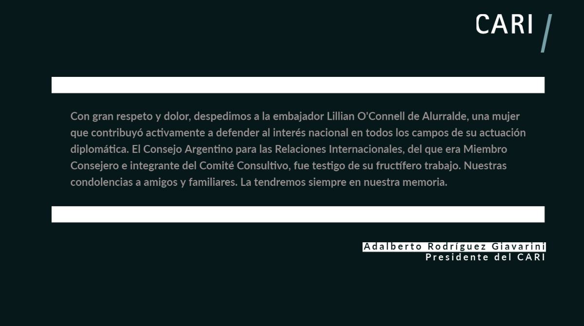 Despedimos a la embajador Lillian O'Connell de Alurralde, Miembro Consejero e integrante del Comité Consultivo del CARI.pic.twitter.com/yGeWdlUwZT