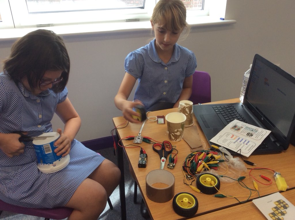 Computing Workshop Some Y5 children are having lots of fun this afternoon programming with a micro computer called a Crumble. They are making their own rotating flashing disco light and a moving car. Thanks to