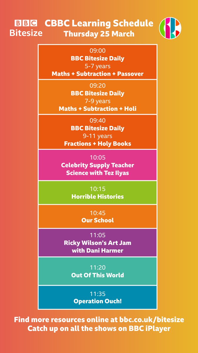 Visit @CBBC at 9am (primary),@BBCTwo at 1pm (secondary), catch up anytime on@BBCiPlayer, and head to http://bbc.co.uk/bitesize for specific guides.pic.twitter.com/8D0tVzZOXZ