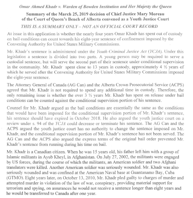 Updated story @CBCNews about an Alberta's judge deciding today to declare Omar Khadr's full sentence over. Also, the 2-page summary from the court explaining today's decision is attached. http://cbc.ca/1.5068610 pic.twitter.com/bGYwt1SwZq