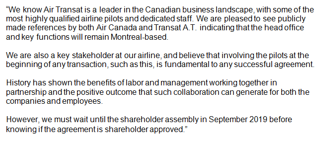 Pierre Lessard, chair of the Air Transat pilots' union, says the group is pleased key functions will remain Montreal-based after an acquisition by Air Canada. He says it's important for the pilots to have a voice in transactions like this one. Full statement:pic.twitter.com/AepOPb20FH