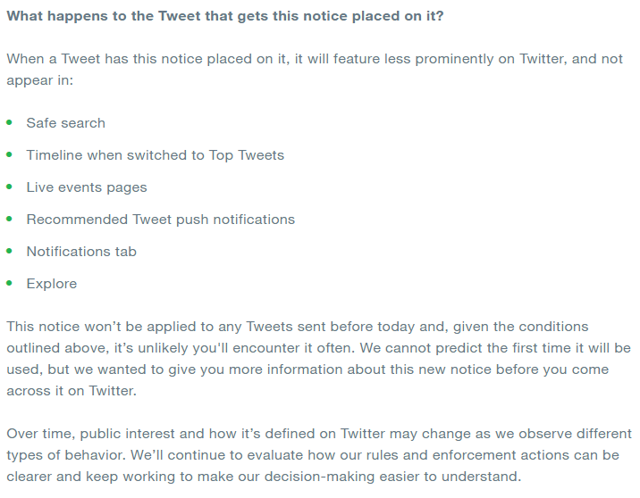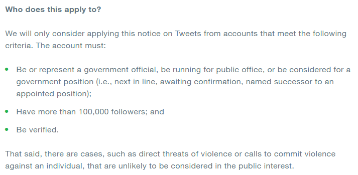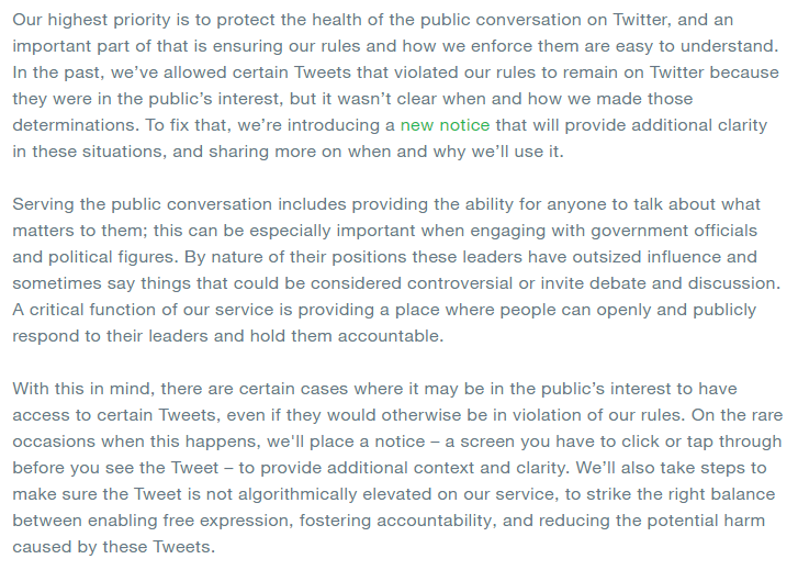 A Twitter blog post has just announced that the social media giant will tag but not remove tweets from verified accounts of world leaders and governments that break its rules. The measures won't be retroactive. Excerpts from the blog post:pic.twitter.com/nwRnGMlOua