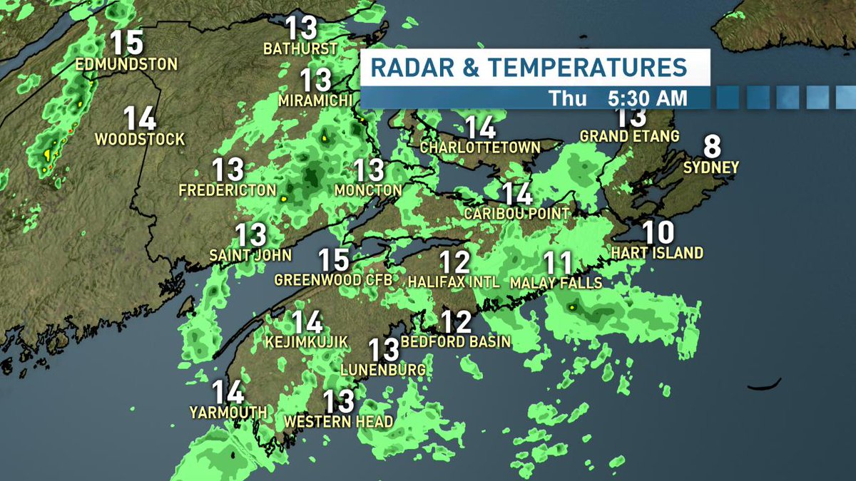 Round 1 of rain this am. Round 2 this afternoon with chances for T-Storms for NB. Most will pick up 5 mm of rain but there will be higher totals near and underneath developing T-storms (10-15mm).