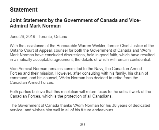 Vice-Admiral Mark Norman is retiring 'after consulting with his family, his chain of command and his counsel.' Comes after a breach-of-trust charge against the high-ranking military official was stayed last month. Background: http://cbc.ca/1.5127752 pic.twitter.com/ABLkZbTBsl