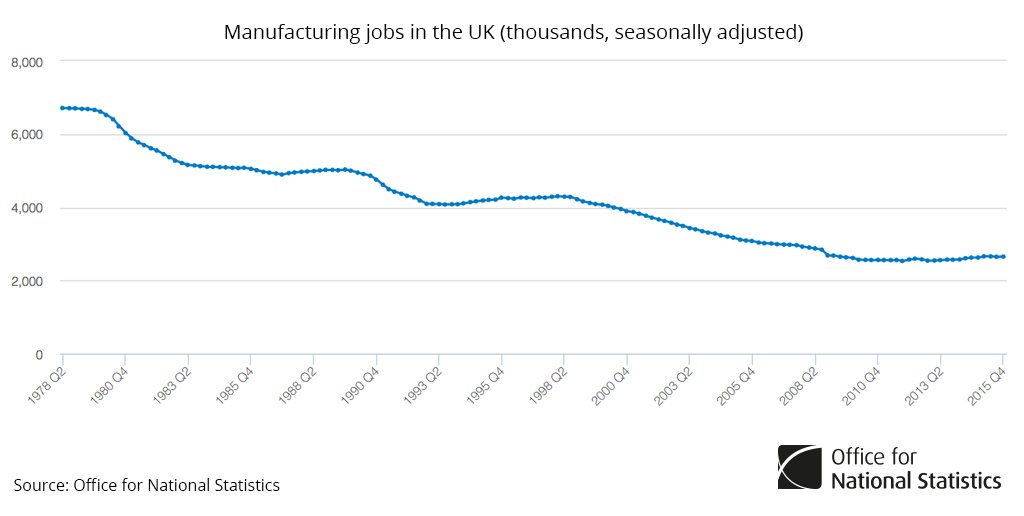 .@CBIBizVoice No of jobs in UK manufacturing sector fallen from 6.7m in 1978 to 2.7m in 2015 http://ow.ly/4npQKR pic.twitter.com/LQA2MwvGji