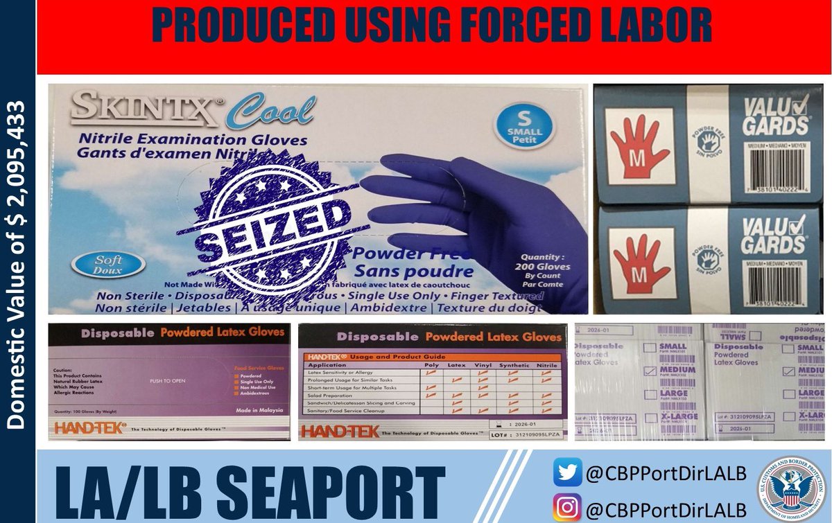 @CBP Officers seized over $2M in disposable gloves manufactured using forced labor. In addition to examining cargo for counterfeit and dangerous goods, CBP Officers ensure imported items were not produced using forced labor. https://bit.ly/3k98ALZ pic.twitter.com/rlHlOPfpau