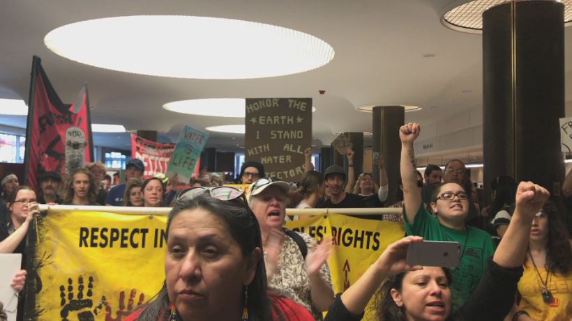 #DakotaAccessPipeline protesters jam lobby of @WellsFargo Bank in downtown #Denver asking to be heard. @StanBushTV 10pm #DAPLpic.twitter.com/KwYGLSVoBs