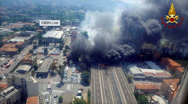 "The Italian news agency ANSA reported the explosion was caused by an accident involving a truck that was transporting flammable substances, which exploded upon impact."