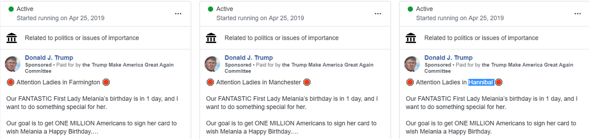In addition, the Trump campaign is already deeply involved in Beta testing its micro-targeted outreach and ads through Facebook. Are Dems doing anything about this? Are Dems doing anything like this?https://twitter.com/juddlegum/status/1121438737056051200 …