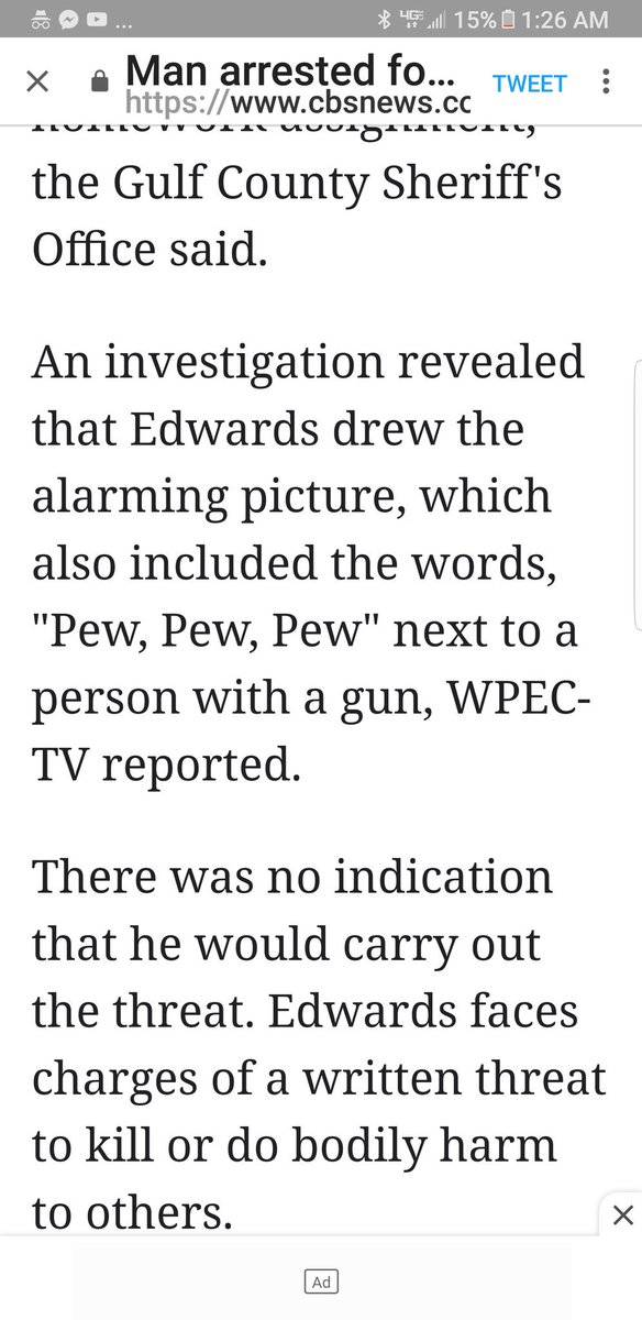 A lot of people on this thread aremaking jokes , but as tasteless as this drawing may be , he committed no crime. He made no direct threat. This is just the beginnings of Americans 1st Amendment rights being taken away.