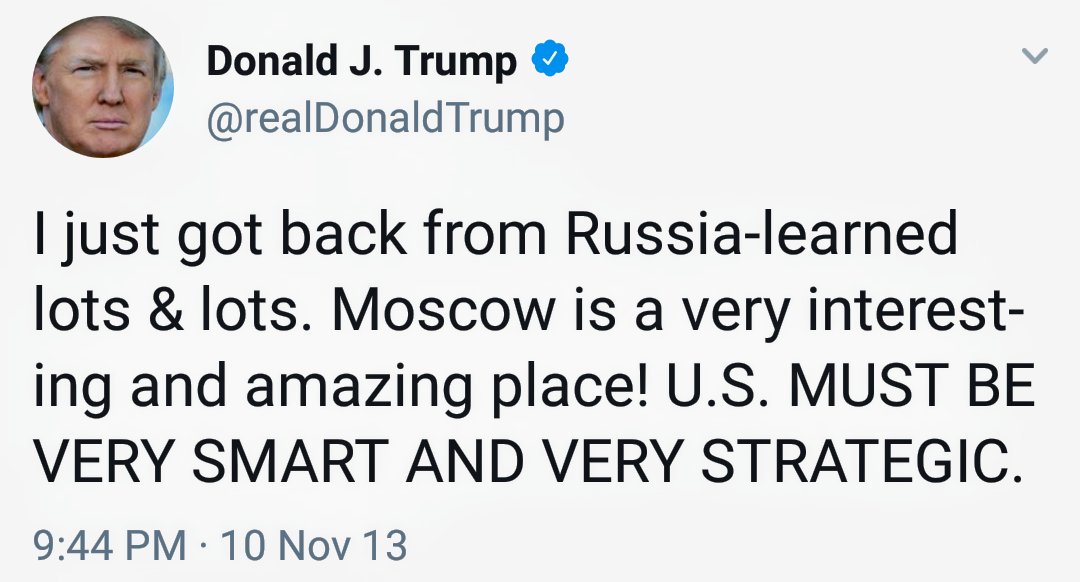 “I have nothing to do with Russia”. Except your tower there, your many trips there, your meetings with Putin, your Donnie Jr crowing about how a lot of Trump income comes from Russia, your gang meeting with the Russian lawyer in Trump Tower, pageant there...