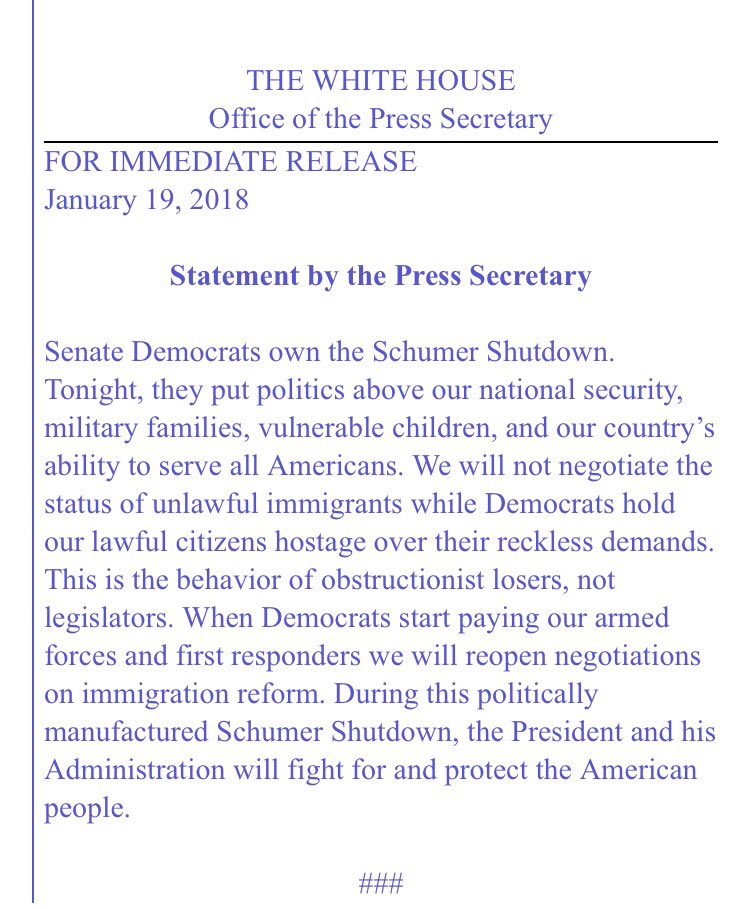 @PressSec@POTUS : Typical bullying, unprofessional non-productive statement from White House! When will the U.S. ever have a REAL leader again? As@realDonaldTrump said when shutdown occurred under Obama:"Responsibility for the shutdown begins & ends w/the POTUS"#TrumpShutdown -