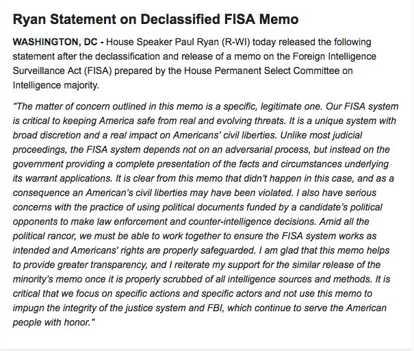 House Speaker Ryan on declassified FISA memo: "I am glad that this memo helps to provide greater transparency, and I reiterate my support for the similar release of the minority’s memo once it is properly scrubbed of all intelligence sources and methods." http://cbsn.ws/2EAeIYE pic.twitter.com/bDNJo0mNiH