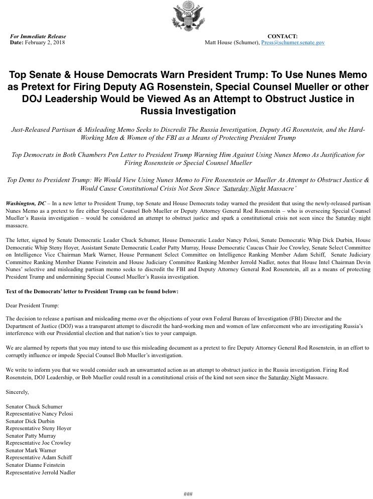 Sen. Schumer calls Nunes memo "partisan and misleading." Top Democrats warn Pres. Trump use of the memo as pretext to fire either Special Counsel Bob Mueller or Deputy Attorney General Rod Rosenstein could be viewed as attempt to obstruct justice: http://cbsn.ws/2EAeIYE pic.twitter.com/6qNauTQPsJ