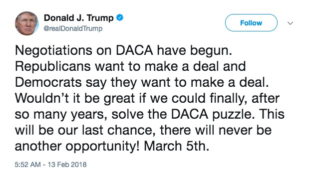 Trump is willing to deal and fix immigration wonder if the Dumocrates are smart enough to take. Because the dreamers are getting smart on them fast.
