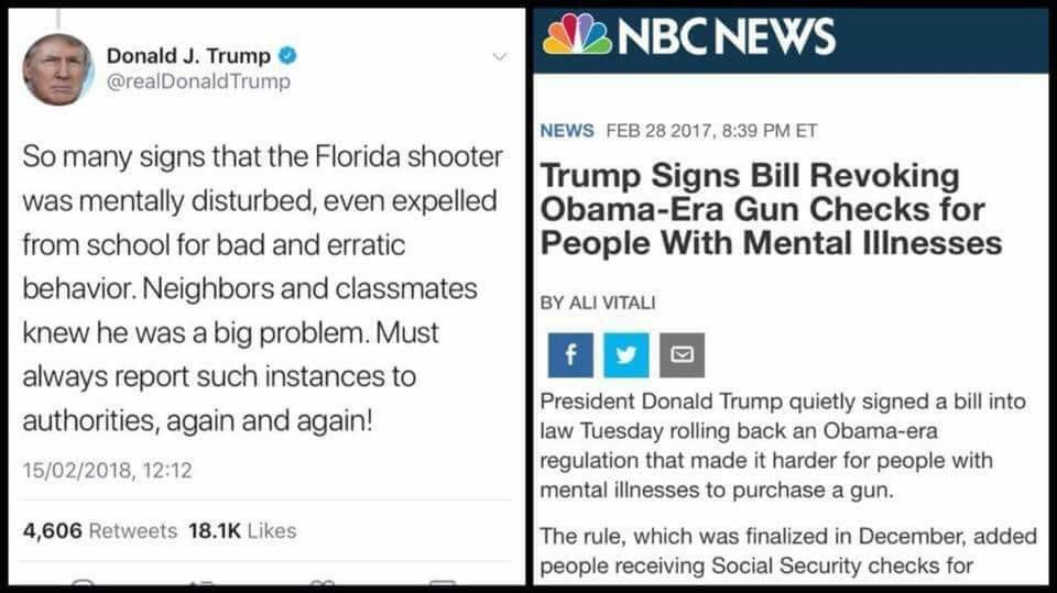 Suffering from GOP amnesia again, trump forgot he signed a bill which made it very easy for his supporter to get that gun and kill those children. He's clearly aware Mueller's latest indictment is very bad news for him however.