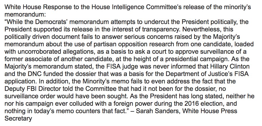 White House responds to release of Democratic memo: “This politically driven document fails to answer serious concerns raised by the Majority’s memorandum about the use of partisan opposition research.” http://cbsn.ws/2ESCa6s pic.twitter.com/194Ry152NF