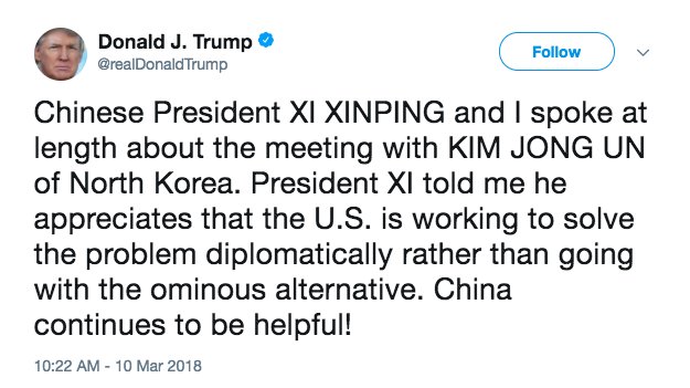 @realDonaldTrump doesn’t consult with WH staff about NK, like Sec of State Tillerson, but goes to the Chinese dictator for advice? Wow, why is the Legislative branch allowing this?#impeachTrumpThanks. Twitter will use this to make your timeline better. UndoUndo