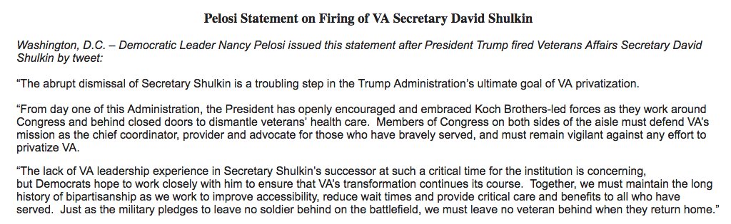 “The abrupt dismissal of Secretary Shulkin is a troubling step in the Trump Administration’s ultimate goal of VA privatization." House Minority Leader