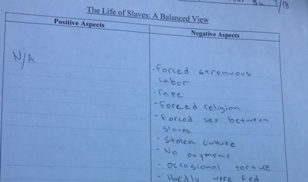 Here's a photo of the assignment. It's entitled "the life of a slave" - you're to list benefits of THEIR life not those of the white supremacist slave owners. So that should clear up any doubts you might have.pic.twitter.com/8MIUkIflet