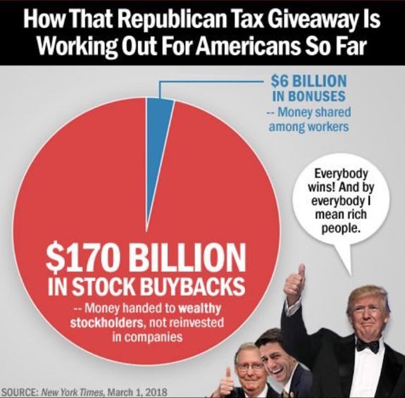 We’ve seen about $6 billion in bonuses versus more than $170 billion in stock buybacks that hand tax-cut money to wealthy stockholders. Money spent on buybacks isn’t being invested in plants, equipment, or jobs which was the supposed point of the tax cut.https://www.nytimes.com/2018/03/01/opinion/taxpayers-scammed-republicans.html …
