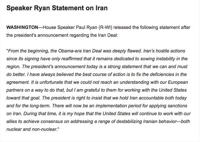 House Speaker Paul Ryan on President Trump's announcement on the Iran nuclear deal: "The president’s announcement today is a strong statement that we can and must do better." https://cbsn.ws/2wuyYtY pic.twitter.com/23MLPj5UeK