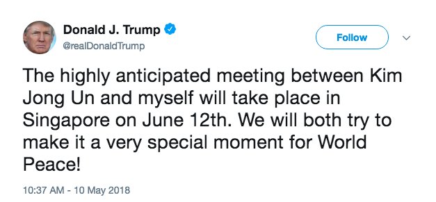 The most "special moment" for world peace would be Trump's resignation!! (Note the growing Israel vs. Iran conflict just two days after the US pulled out of the Iran nuclear agreement)