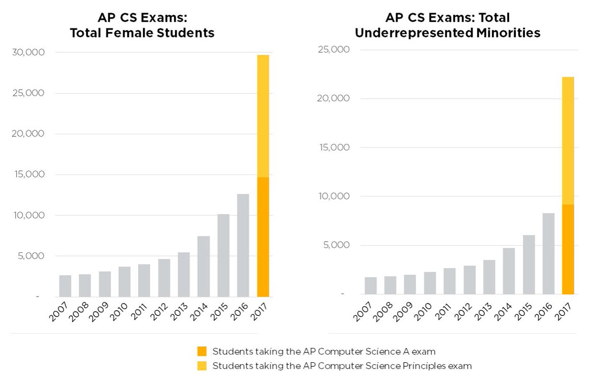 Female students increase in AP CS exams by 135% since 2016. Underrepresented minorities up 170% over last yr https://medium.com/@codeorg/girls-set-ap-computer-science-record-skyrocketing-growth-outpaces-boys-41b7c01373a5 …pic.twitter.com/bFMUAXovf0