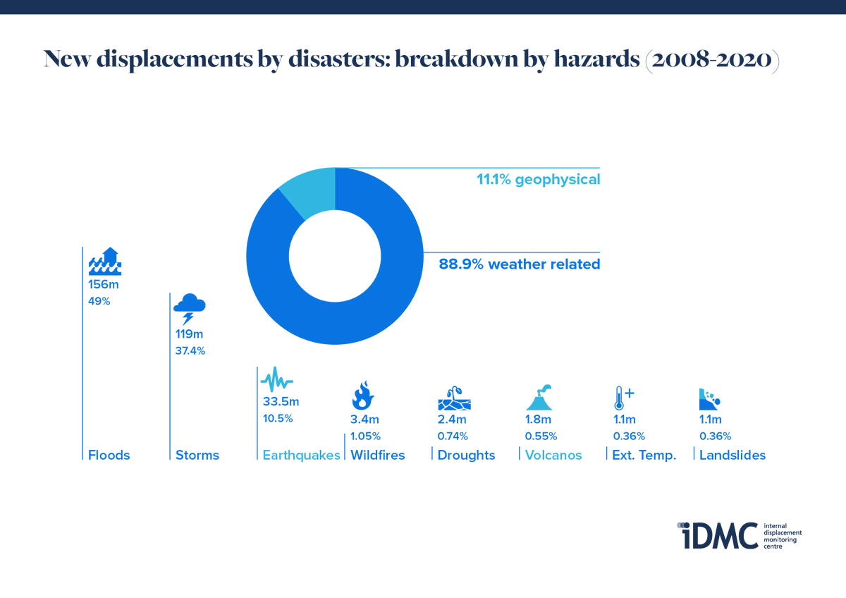 #GRID2021 from@IDMC_Geneva 2020 saw intense storms and persistent conflict. 40.5 million new displacements were triggered by disasters and violence, a ten-year high. This is a key issue for national#DRR strategies https://bit.ly/3wkAuch pic.twitter.com/pVf3QAUZ0X