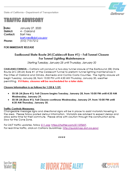 See Caltrans advisory on upcoming, expected Caldecott Tunnel closure going East on Highway 24. Expect delays and drive safe.https://twitter.com/CaltransD4/status/1221868352315871233 …