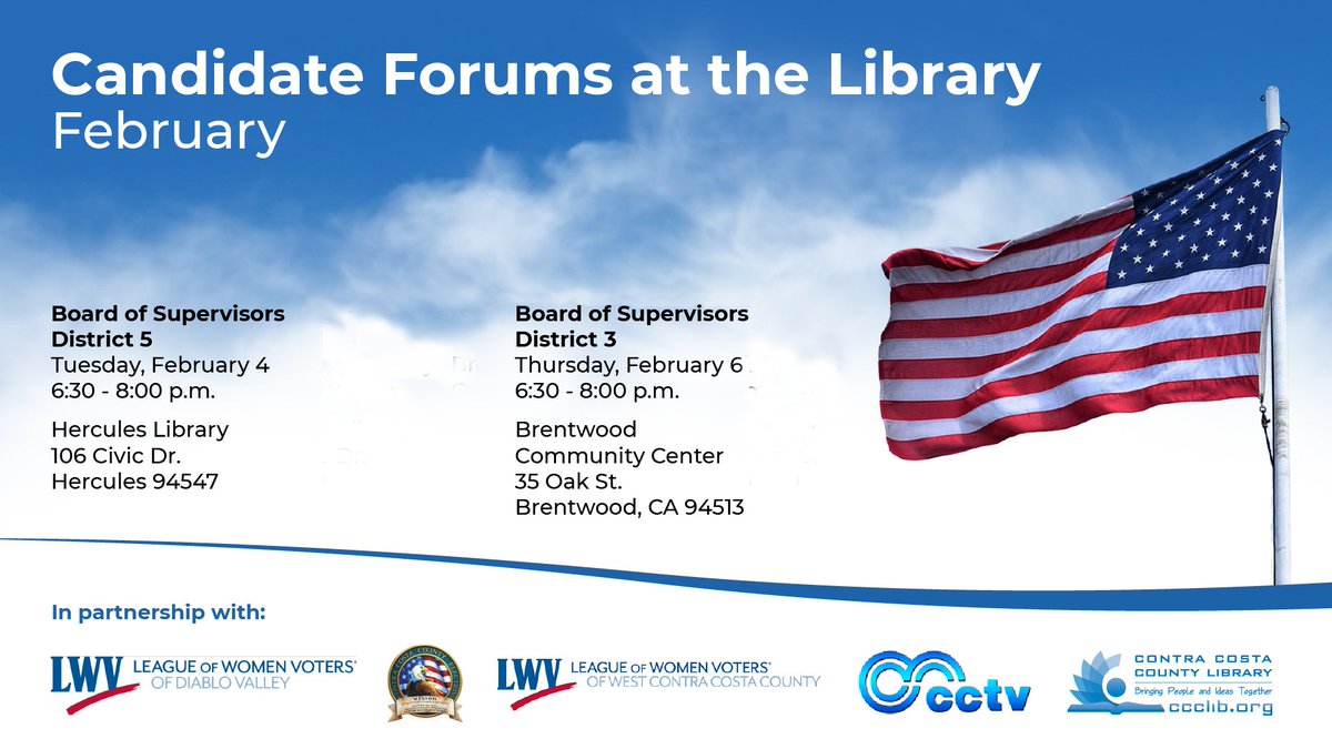 Watch the County Library’s Election Forums live in person or on FB next week. See other Election Preview programs at Contra Costa TV at http://contracosta.ca.gov