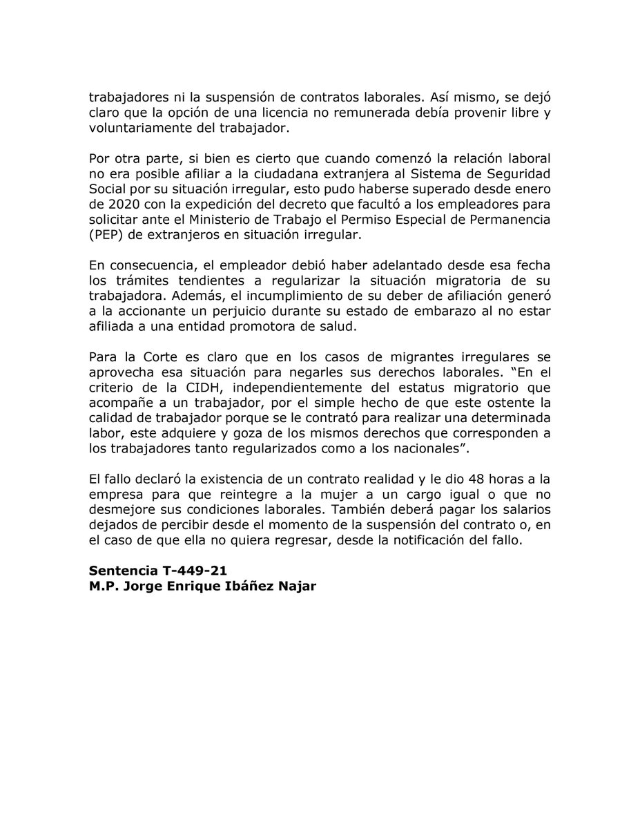 #LaCorteInforma I Corte protege derechos laborales de una inmigrante en situación irregular. Sentencia T-449-21. M.P. Jorge Enrique Ibáñez Najar.pic.twitter.com/lXAlX6tysI