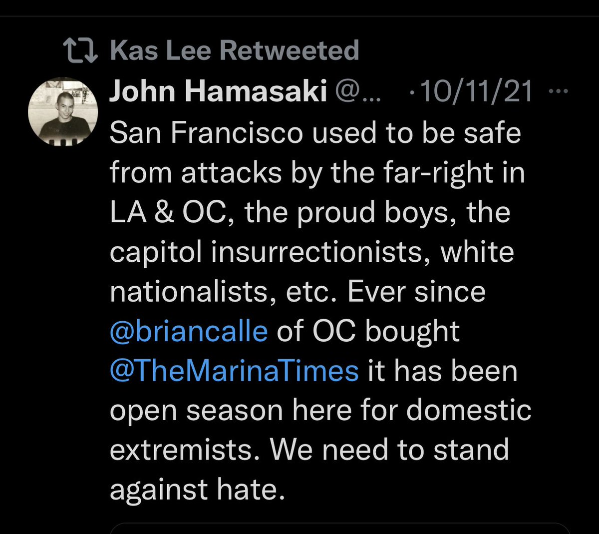 Why is ⁦@chesaboudin⁩ “victim advocate” @kasefiles retweeting Hamasaki trying (and lying) to tie the new owners of this newspaper to the proud boys, Capitol insurrectionists, and domestic extremists? Perhaps because this newspaper has been critical? Keep it klassy, Kasie.pic.twitter.com/f6zQTHWA3v