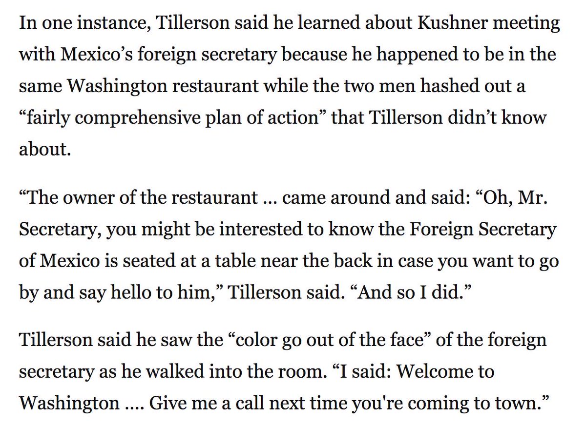 Rex Tillerson's anecdote about having no idea the Mexican foreign secretary was in DC until running into him at a restaurant having dinner with Kushner is... wowpic.twitter.com/GSTTyuwBIe