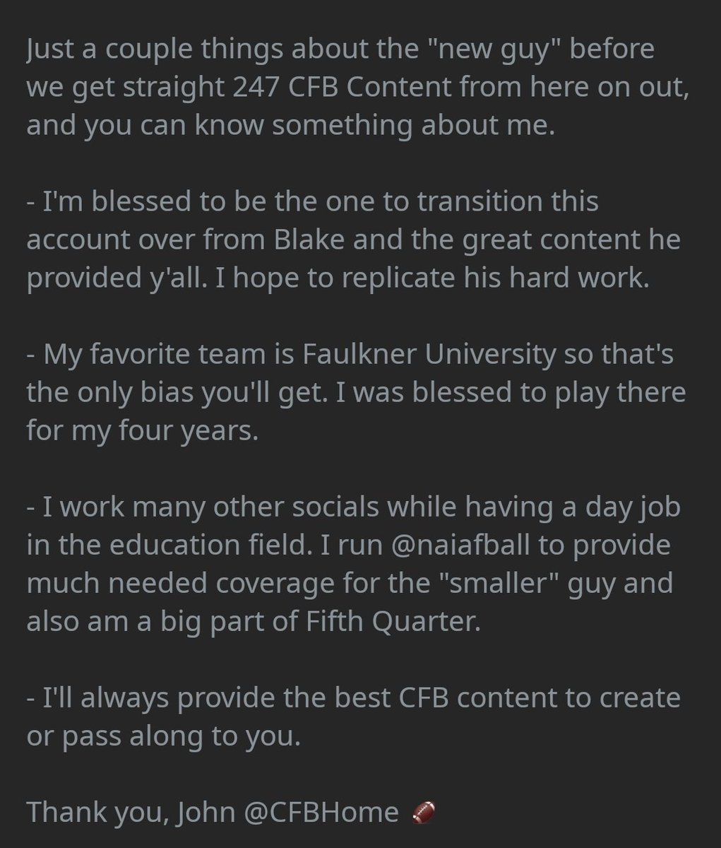 This is my third day on the account as the "new guy." One last annotation about myself, and it's straight CFB content from here