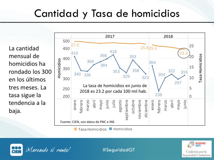 Hay una reducción histórica en #SeguridadGT en la tasa de homicidios. Al mes de junio 2018 la tasa se registra en 23.2 homicidios por cada 100 mil habitantes.pic.twitter.com/FsRA2GwxUd
