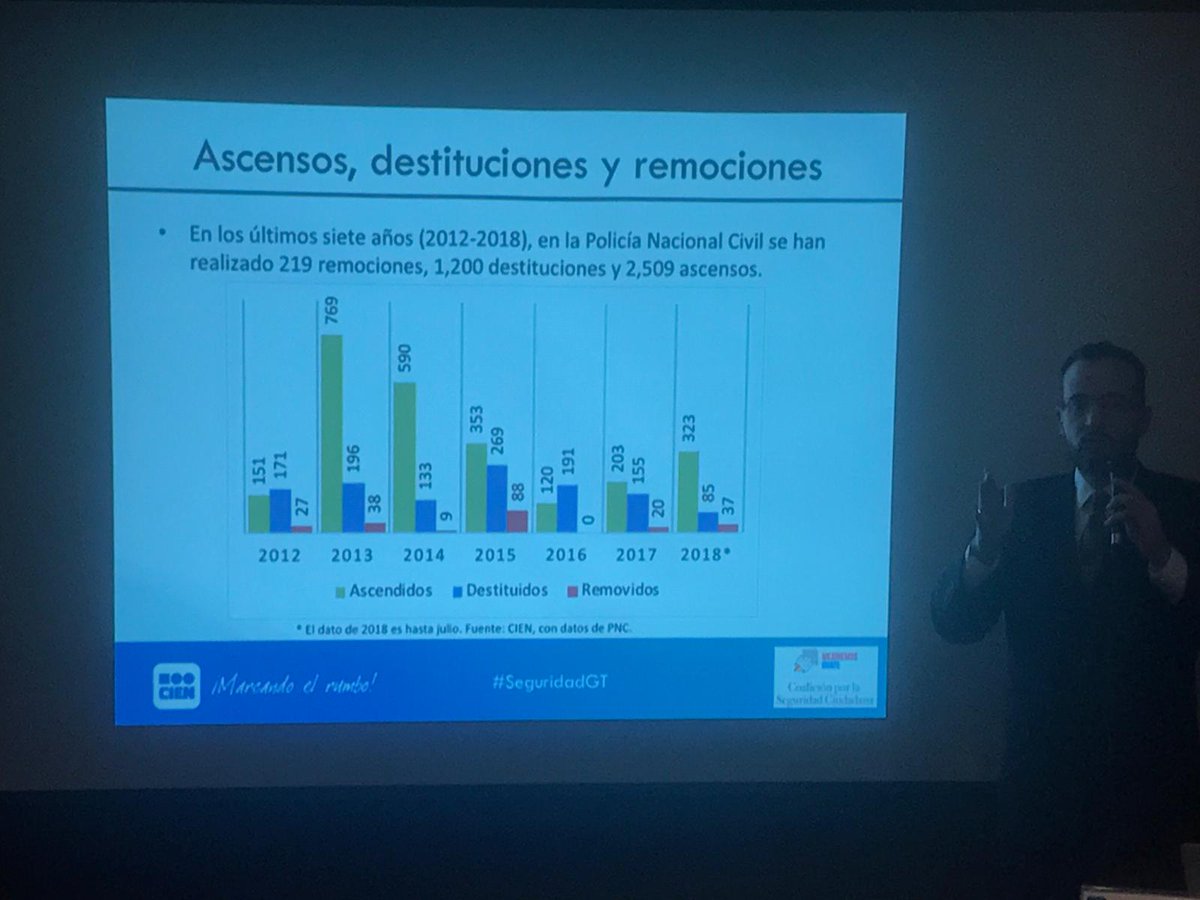 Según con el @CIENgt en los últimos 7 años, en la PNC se han llevado a cabo 219 remociones, 1,200 destituciones y 2,509 ascensos. Vía: @oscarcanel_eu pic.twitter.com/m4varvVSRX