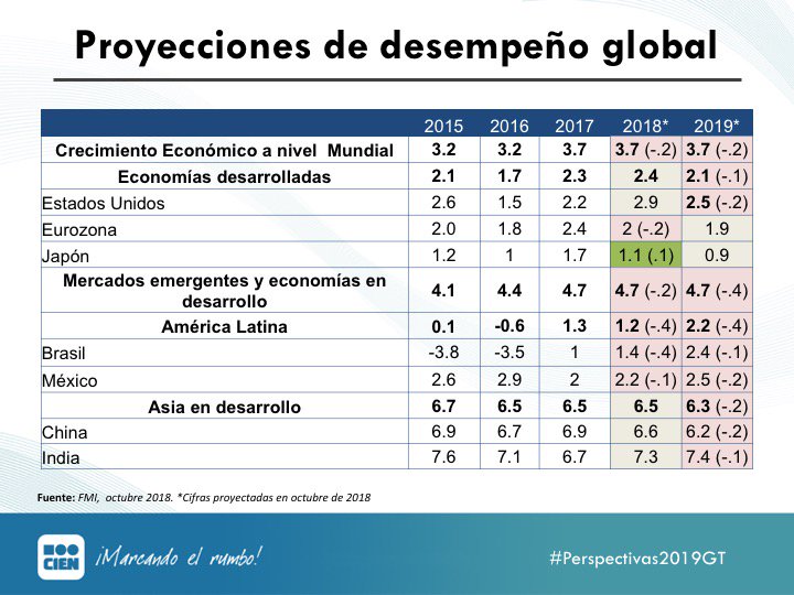 "Estados Unidos y el resto de países que se han beneficiado de la aceleración económica, ya están previendo una desaceleración a nivel global. Esto afectará las #Perspectivas2019GT" indica Hugo Maul R.pic.twitter.com/PaJfqnWS0s