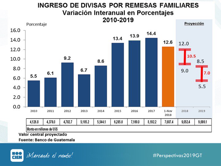 "Las tasas de crecimiento de las remesas para Guatemala están en dos dígitos, pero no dependen de nosotros exclusivamente, por lo cual es preocupante calcular a largo plazo una estabilidad de crecimiento dentro de ellas" opina @jdcasasola en #Perspectivas2019GTpic.twitter.com/gYIpEFOyK8