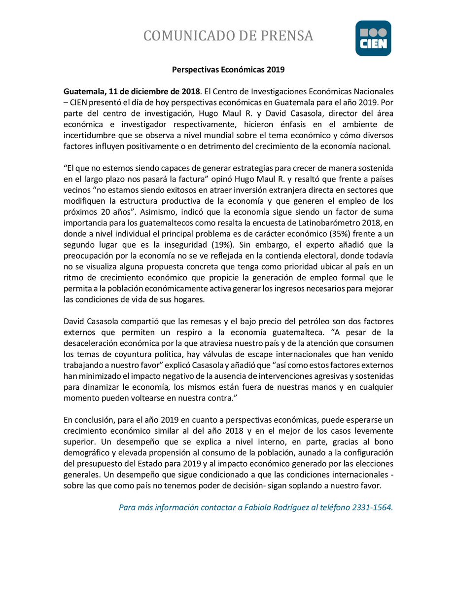 Compartimos con ustedes el comunicado de prensa sobre #Perspectivas2019GT.