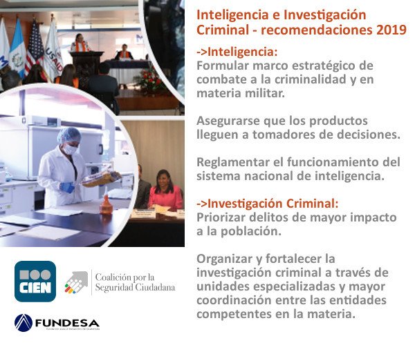 Desde la Coalición por la Seguridad Ciudadana se realizan estudios en #SeguridadGT y Justicia. A continuación las recomendaciones para 2019 en el área de Inteligencia e Investigación Criminal: