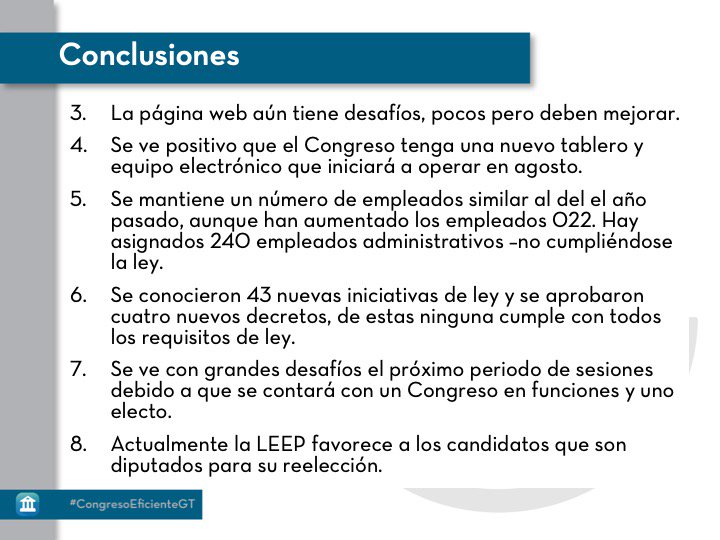 "La página web podría mejorar" indica @LineasFrescas en las conclusiones de #CongresoEficienteGT "pero no se debe olvidar que vienen las elecciones de Magistrados a las Cortes también, por lo cual la ciudadanía debe estar vigilante".pic.twitter.com/qzomd7usj3