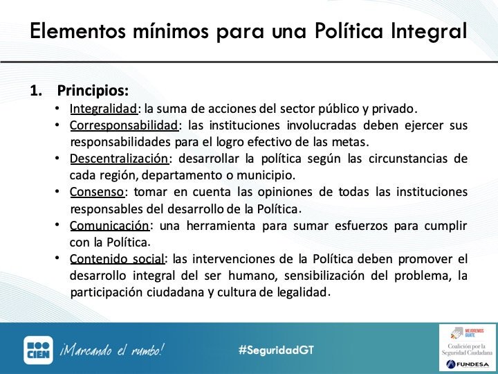 "La política que estamos proponiendo" explica Leiva en #SeguridadGT "debe contener elementos mínimos dentro de los cuales los principios son fundamentales para tomar en cuenta la integralidad y otros elementos que aseguren una implementación exitosa y efectiva."pic.twitter.com/Ygdu41quUg