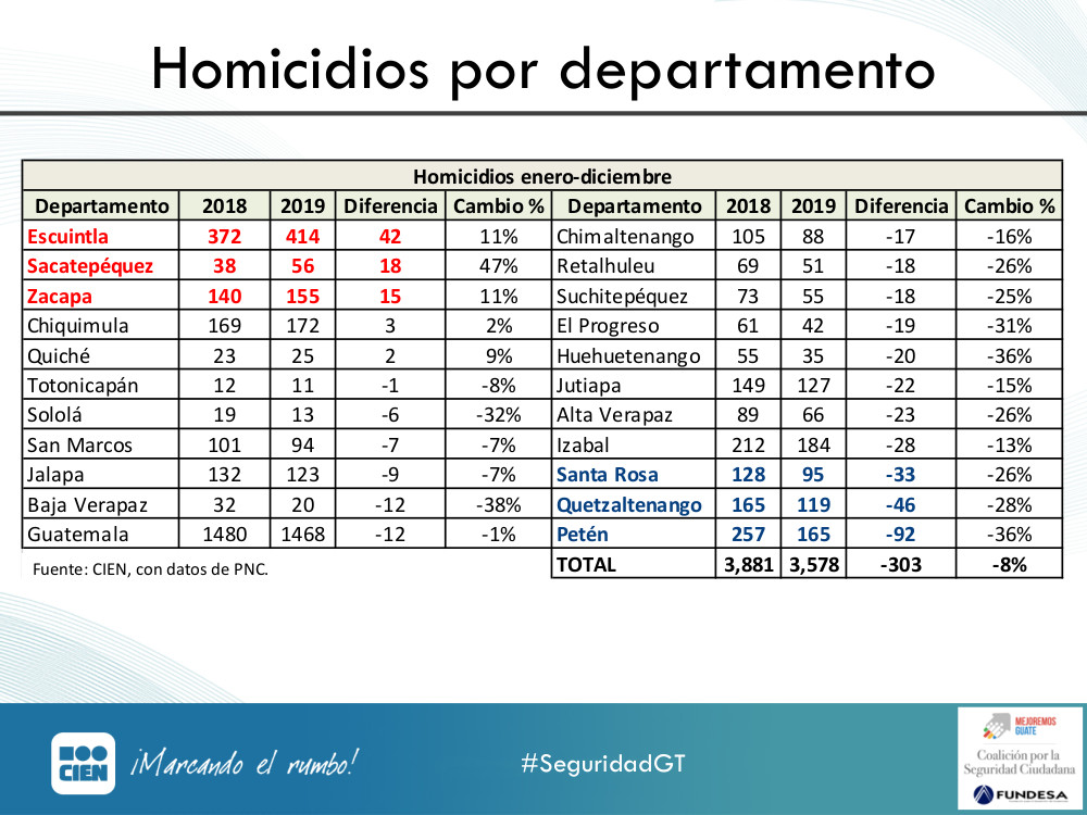 Escuintla, Sacatepéquez y Zacapa aumentaron la cantidad de homicidios en 2019 (comparado con 2018) y Santa Rosa, Quetzaltenango y Petén la redujeron. Importante conocer datos de #SeguridadGT para implementar políticas públicas que mejoren la calidad de vida de los guatemaltecos:pic.twitter.com/uqei735Kj6