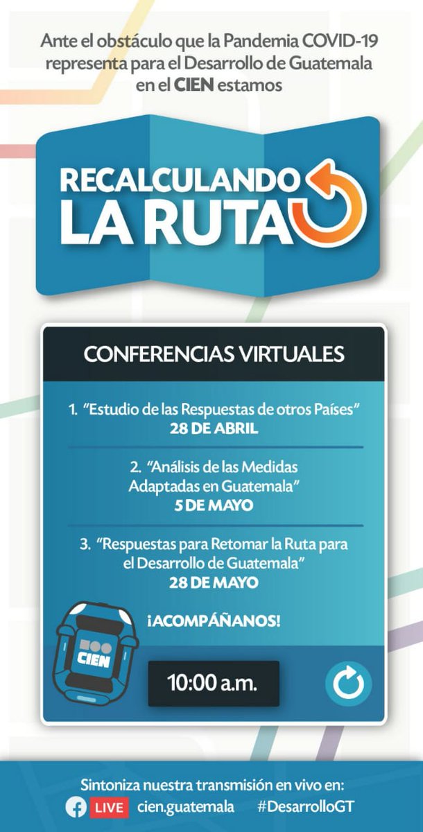¡Reserve las fechas! En el CIEN estamos recalculando la ruta para el #DesarrolloGT. Tendremos tres conferencias virtuales para aprender, analizar y proponer cómo retomamos el camino ante la pandemia #COVIDー19