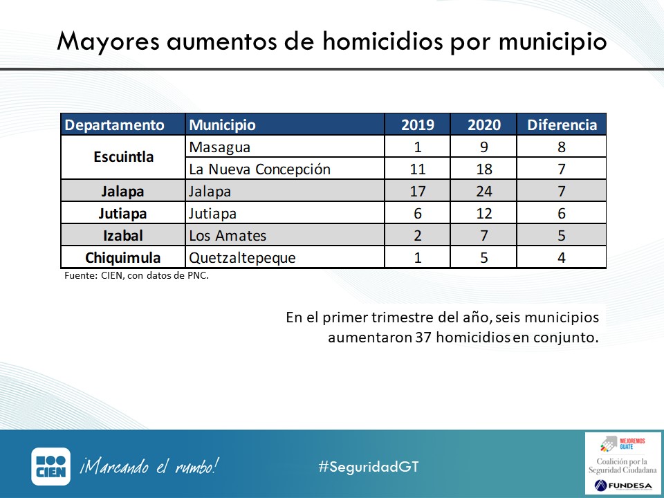 "Nueve municipios del país redujeron 198 homicidios pero se debe poner atención a otros seis municipios en donde la cantidad de homicidios aumentó, como Masagua y La Nueva Concepción, con 18 homicidios (7 más que el año pasado)" @walter_menchu en #SeguridadGTpic.twitter.com/dNyu4ZL4PM