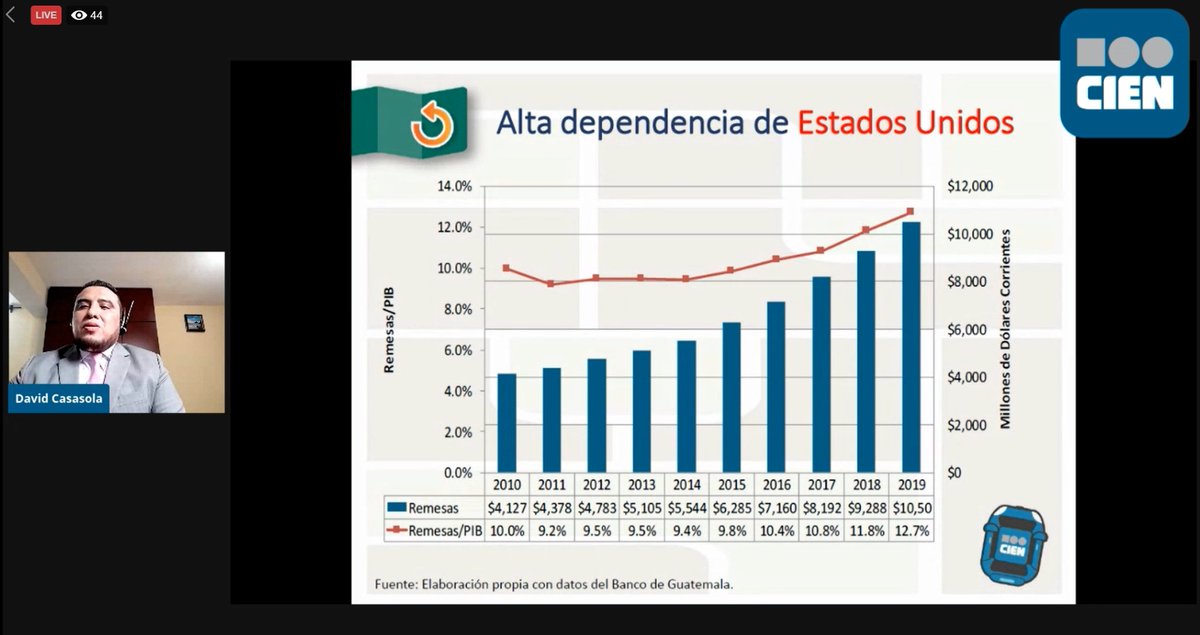 "En el CIEN hemos resaltado la dependencia de remesas que se envían de Estados Unidos, crecimiendo a tasa de 2 dígitos. Aparte que EEUU nos compra 33% de exportaciones, es de donde importamos el 37% de lo que consumimos y que nos envía el 98% de remesas" @jdcasasola #DesarrolloGTpic.twitter.com/sg4vepce6a